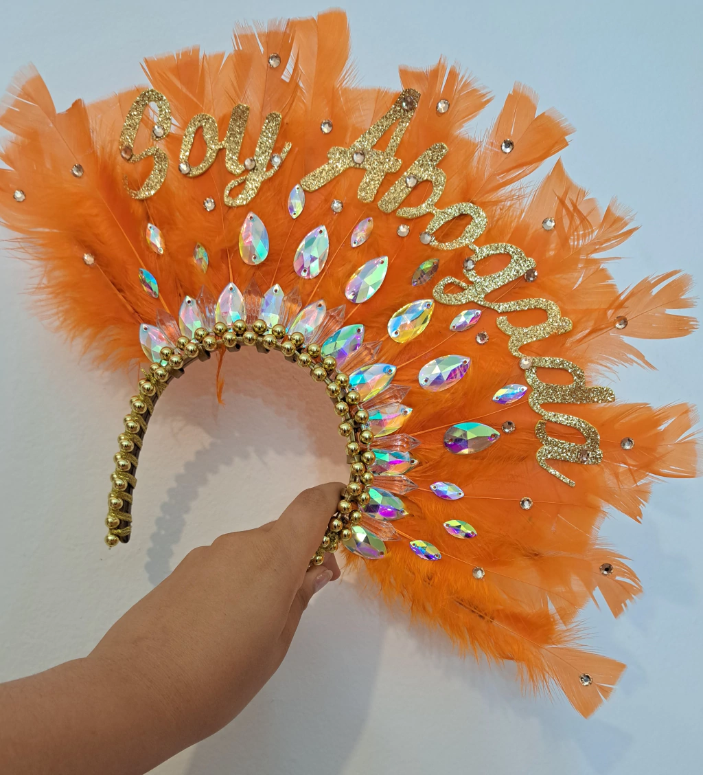 Diadema base dorada de plumas Gallo color blanco con detalles en piedras boreales y frase "Reina"