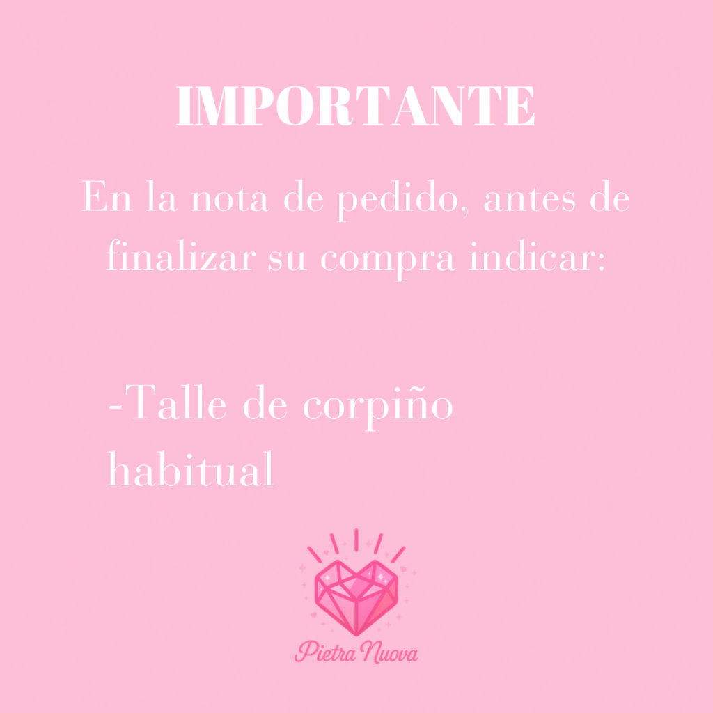 Al hacer tu compra, no olvides especificar en la nota de pedido el talle de corpiño que necesitás. ¡No dejes pasar la oportunidad de deslumbrar con este corpiño único!