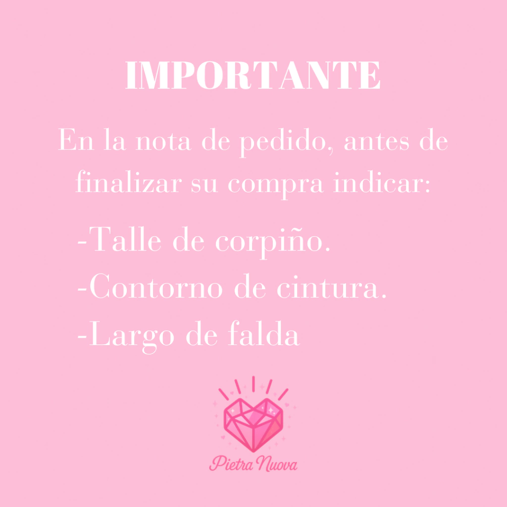 Detalles importantes: - Al realizar tu compra, indica en la nota de pedidos los siguientes datos: - Talle de corpiño - Largo de falda - Contorno de cintura - Tiempo de confección: de 3 a 10 días corridos.